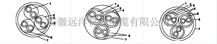 1、對(duì)絞線組 2、隔離層 3、對(duì)屏蔽 4、隔離層 5、填充 6、總屏蔽 7、隔離層外護(hù)套