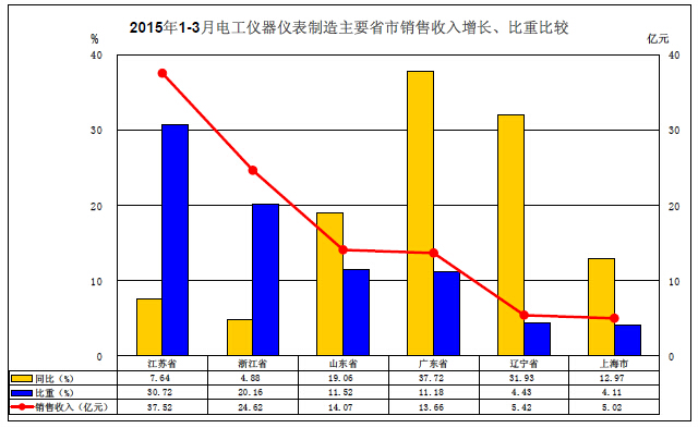 1、20151-3月電工儀器儀表業主省市銷售收入增、比重比較